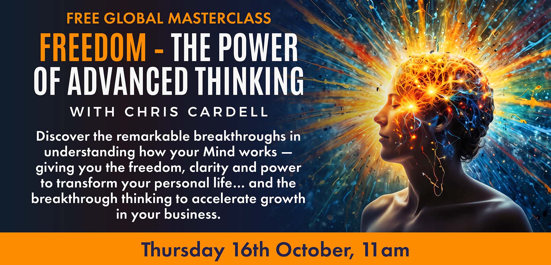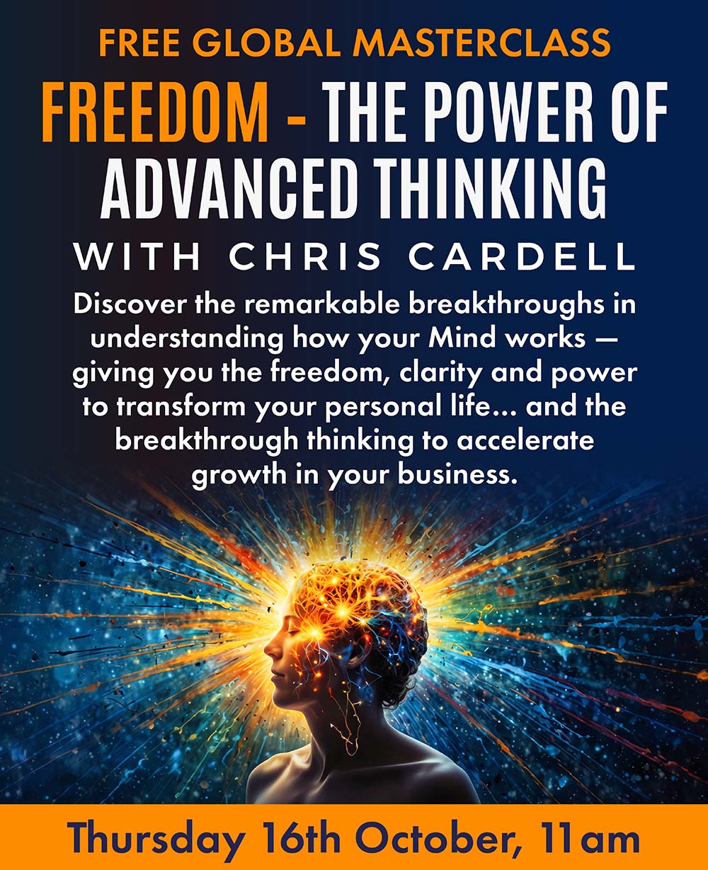 In this exclusive Free online event, with Chris Cardell, a world leader in Advanced Thinking Technologies, you’ll discover how to harness the full power of your Unconscious Mind to create breakthroughs in your life—quickly and effortlessly.