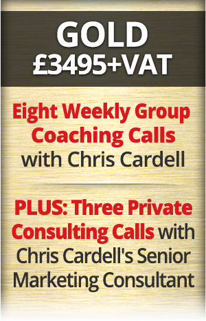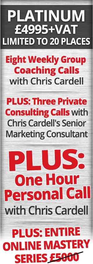 The Platinum option includes everything in Gold plus £5000 of bonuses from Chris’s complete Online Marketing series – plus the BIG one – a private one hour consulting call with Chris Cardell. Clients pay up to £60,000 per year to consult privately with Chris. In your one hour call. Chris will personally review your website with you and quickly identify the key changes you need to make to double or triple your online profits. Then the rest of the time is yours to ask Chris ANYTHING about your business. Expect your personal hour with Chris to be worth tens if not hundreds of thousands of pounds. This priceless opportunity is only available to a maximum of 20 business owners, so act fast...